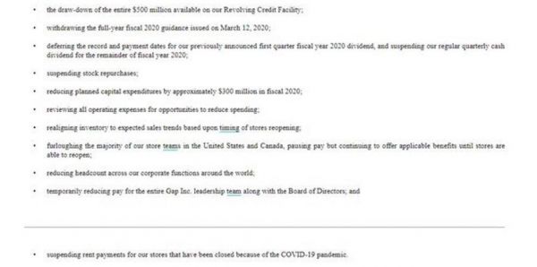 为了应对疫情带来的“大萧条”。GAP集团正在采取一系列“止损”措施,包括:给8万多名员工停薪,暂停股票回购,暂停发放股息、终止支付租金等。