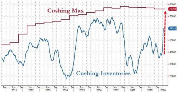 美国陆地原油运输枢纽、WTI原油期货交割地库欣的储油量已经相当于6000多万桶,在7600万桶的总库容中占比高达近80%。按照这速度,剩余储油空间三、四周内就会耗尽。