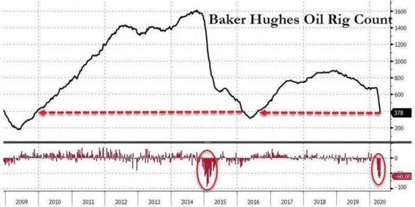 美国仍在运营当中的石油钻井平台数量正迅速下降,从疫情爆发之前的大约650个锐减至上周的378个,创出四年最低水平,关停数量超过四成。