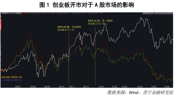 从创业板开通时情况来看,无论是2009年10月30日创业板发行第一批28只股票,还是2009年12月25日第二批8家创业板公司上市,都对A股市场没有显著影响(见图1)。
