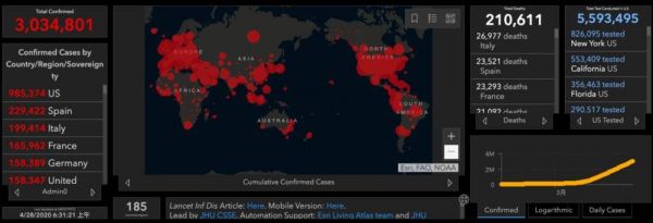 根据美国霍普金斯大学的最新数据(截至北京时间4月28日6点30分),全球新冠病毒确诊患者已经超过300万,死亡人数超过21万。