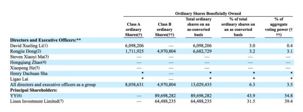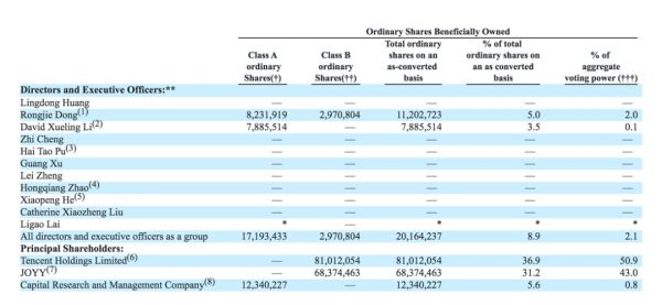 而虎牙CEO董荣杰持有5.0%的股份和拥有2.0%的投票权,而一年前的持股比例和投票权分别为3.2%和3.1%,变化趋势与李学凌类似。