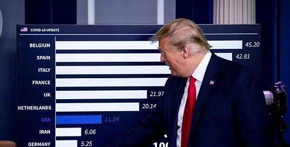 在近期的白宫疫情记者会上,总统特朗普经常会引用一张统计表,试图说服民众不要紧盯高企的死亡人数,而是从全国人口占比考虑,比较“人均死亡率”。