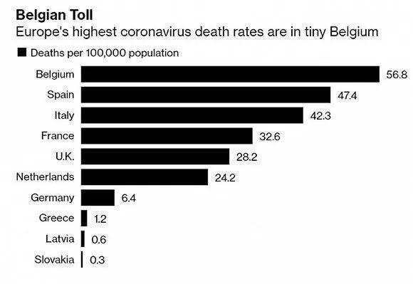 彭博社统计显示,截至24日,比利时每10万人中有高达56.8例新冠死亡病例,是美国的近四倍,为各国最高。在欧洲死亡人数最多的意大利,这一数字为42.3;西班牙为47.4。