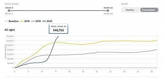 EuroMOMO的统计将24个国家从2009年到2019年的平均死亡人数作为基准线。比较显示,今年第16周,也就是4月13日起算的七天,超额死亡已经超过14万,为2018年以来最高。从3月16日到4月12日,有约7万超额死亡。
