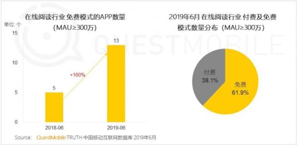 QuestMobile《中国移动互联网2019半年大报告》显示,2019年上半年,在MAU超过1000万的阅读平台中,主打免费的APP超过了五款,MAU超过300万的免费阅读平台同比增长了160%,在数字阅读市场占比达到了61.9%。