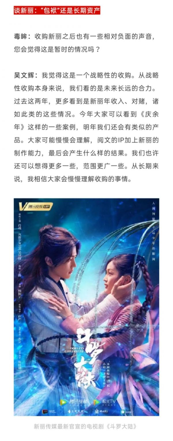 腾讯不够满意的或许还有阅文和新丽的融合。