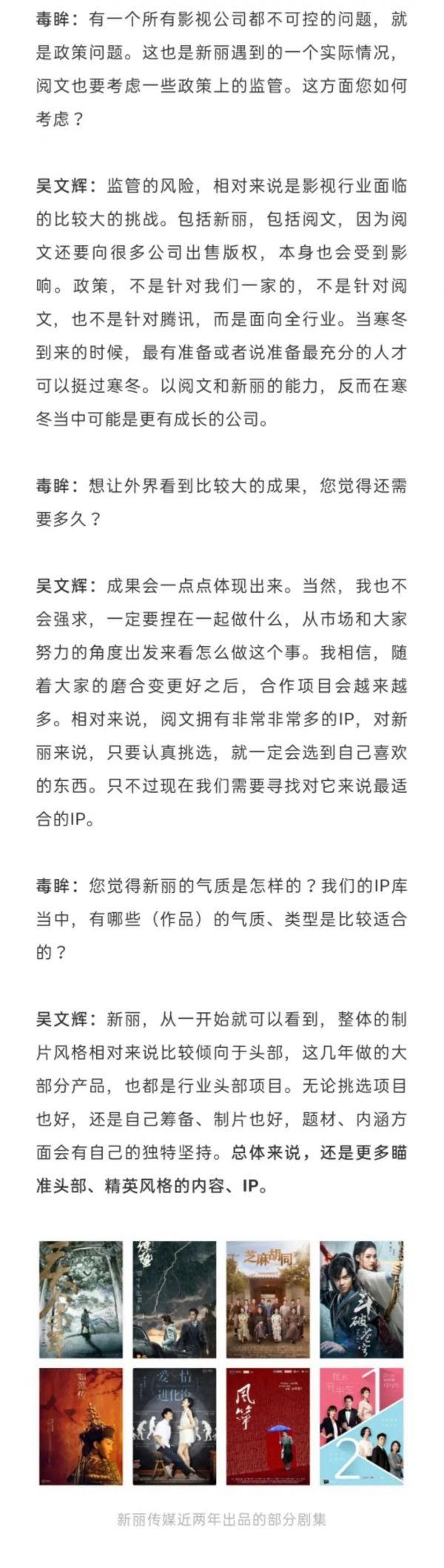 腾讯希望阅文发挥的作用是IP源头而非简单的网文大亨地位,但阅文和新丽的融合并不十分迅速——在之前的采访中,吴文辉也诚恳地告诉毒眸,现在还是属于“摸索”,“双方的认知,如何在同一条线上?在目前还是属于试探的阶段。”