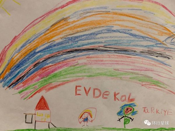 疫情爆发以来,土耳其的孩子们全部得到了特赦一般放假在家。为了鼓励孩子们不要出门,所有学校发起一个“待在家里 EVDE KAL”的活动,每个孩子画一幅彩虹,期待疫情过后的蓝天。