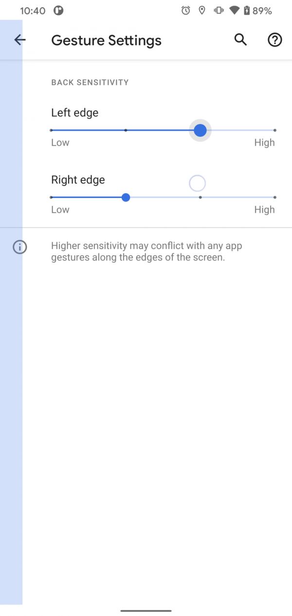 现在我们不仅可以分别设定左右两侧边缘的返回手势灵敏度,在从低到高四个档位之间拖动滑块时,屏幕边缘还会以蓝色覆盖层显示对应的触发区域大小——交互简直和 Android 系统正式引入手势操作方案前市面上一众第三方手势导航工具一摸一样,看来 Google 当时在 Android 10 手势导航开发背景故事中说他们受 Fluid NG 启发不小并不是在开玩笑。