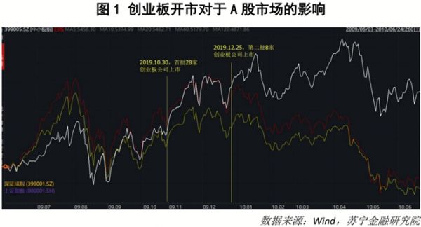 从创业板开通时情况来看,无论是2009年10月30日创业板发行第一批28只股票,还是2009年12月25日第二批8家创业板公司上市,都对A股市场没有显著影响(见图1)。