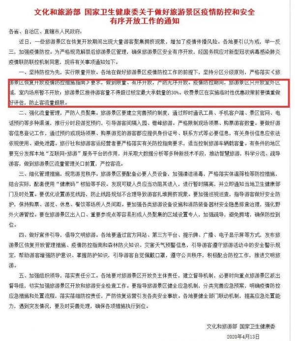 携程数据显示,截止4月15日,全国已有3770家景区恢复开园。但出于疫情防控需要,4月13日文化和旅游部、国家卫生健康委发布《通知》,要求各景区疫情防控期间只开放室外区域,接待游客量不得超过核定最大承载量的30%。通知发布后不久,不少已经开放与将要开放的景区,宣布重新调整景区开放时间及载客量。