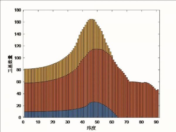 以12000颗卫星作为研究对象,笔者根据公开数据中的轨道分布,计算地面不同纬度的观测者在天空中看到的卫星数目分布,蓝色、红色、黄色分别代表初始覆盖、最终覆盖和第二阶段的低轨卫星。