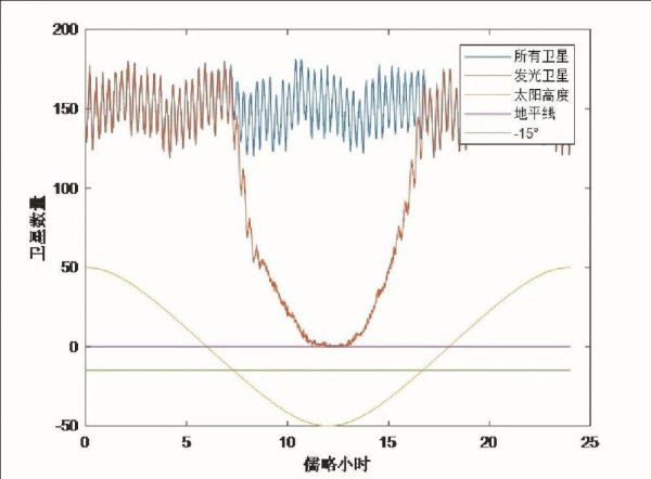 结果表明,在中纬度地区,任意时刻居然有100颗以上的卫星位于20°仰角以上的天空。在北纬45度左右,这个数目达到了160多颗。