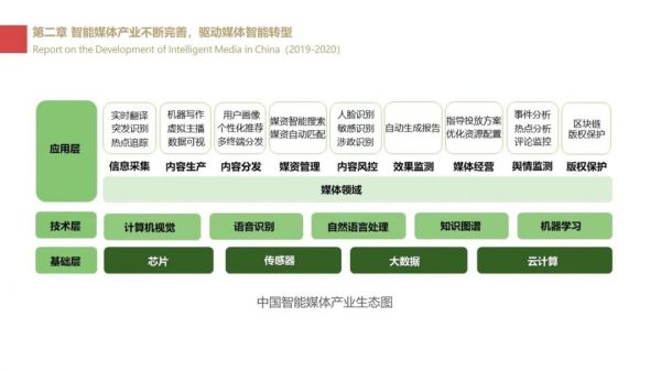 按照人工智能行业的划分,智媒行业也分为基础层、技术层与应用层。基础层以AI芯片、算法架构、计算机语言等研发为主;技术层基于基础层的运算平台和数据资源,主要包括计算机视觉、智能语音、自然语言处理、知识图谱、机器学习等技术。