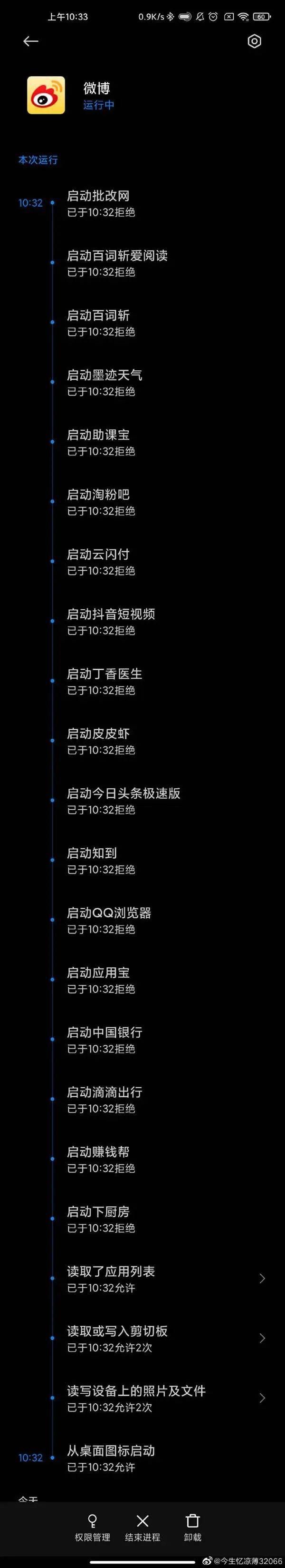 有的人发现单独一个微博 App 从桌面被开启以后,短短 1 分钟内试图疯狂唤醒其他 App ,整得跟宋江和他的梁山兄弟们似的: