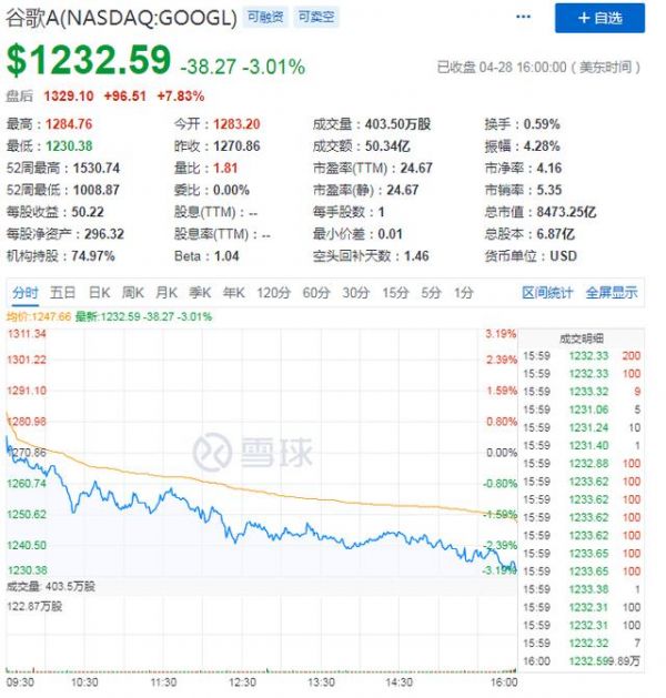 在财报发布后,截止文章发稿,谷歌母公司Alphabet盘后股价为1329.10美元,盘后股价涨为7.83%,市值为8473.25亿美元。