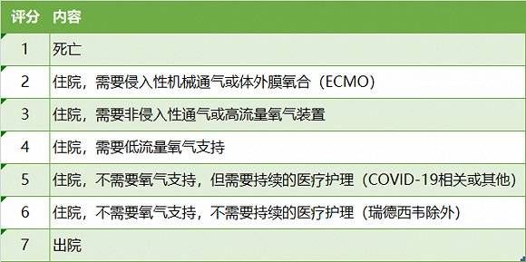 7分顺序量表评估的临床改善率是世卫组织为全球新冠肺炎药物临床试验所设计的临床终点参照,其根据患者状态进行评分,从死亡(1分)到出院(7分)分为7个不同等级,患者以接受治疗时的评分为基准评分,评分提高2分及以上的被认为是产生了“临床改善”。
