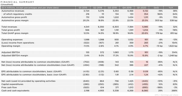 车东西4月30日消息,今日特斯拉正式公布了其2020年第一季度的财报,财报显示2020年第一季度特斯拉第一季度总营收为59.85亿美元(约合人民币423亿元),比去年同期的45.41亿美元(约合人民币321亿元)增长了32%。