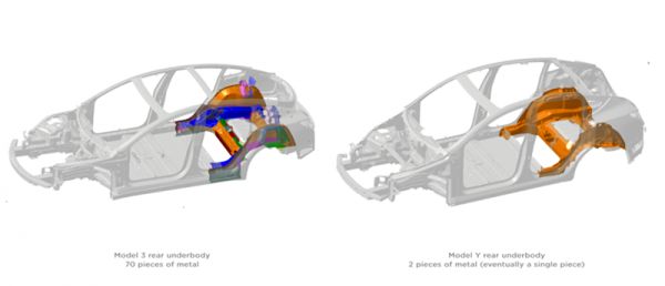 此外,特斯拉还展示了Model Y的车身框架模型,还展示了其在生产方面的工程进步,照片中可以看到特斯拉将Model 3的70 个零件整合成了一个完整的零件。