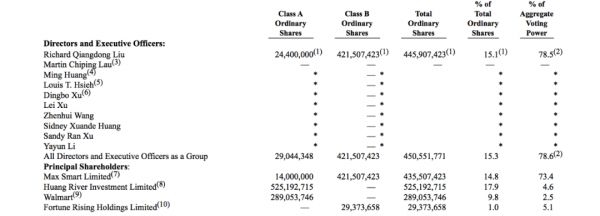 京东2019年财报显示,目前,刘强东个人持股15.1%,投票权达78.5%。腾讯为京东最大外部股东与第一大股东,持股比例达17.9%,投票权占4.6%;刘强东的家族信托MaxSmart Limited持股14.8%;沃尔玛持股9.8%,有2.5%的表决权。