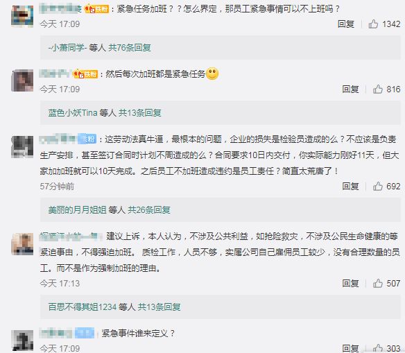 甚至有网友表示“建议上诉,本人认为,不涉及公共利益,如抢险救灾,不涉及公民生命健康的等紧迫事由,不得强迫加班。 质检工作,人员不够,实属公司自己雇佣员工较少,没有合理数量的员工。而不是作为强制加班的理由。”