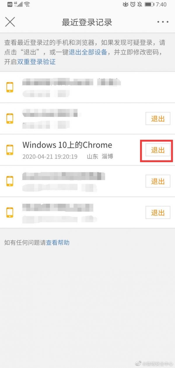 1.建议立即前往微博帐号与安全页面,查看“最近登录记录”。若发现可疑情况,直接点击“退出”。