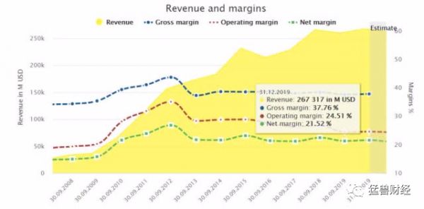 我们也不担心这种做法会以牺牲利润为代价。毕竟,在过去的几年里,尽管销量有了可观的增长,苹果公司还是设法保持了利润率的稳定。从下图可以清楚地看出: