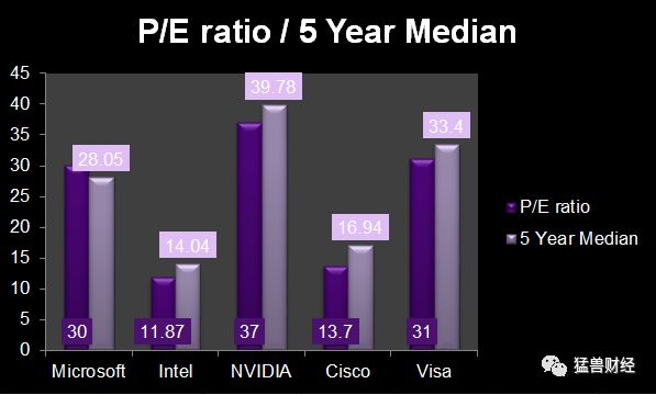 投资者还应该注意到,与其他公司相比,苹果的估值并没有那么高。特别是微软、Visa和英伟达,它们的增长也很强劲,但它们的市盈率也很高,从它们5年的中位数可以看出: