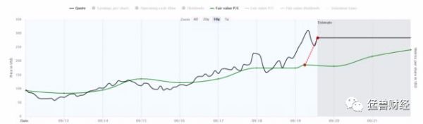 假设2020年的利润为12.38美元,苹果的市盈率约为22.2,这个数字一开始看起来相当高。特别要注意的是,由于新冠疫情、商店关门和消费者消费欲望低迷,硬件业务可能会受到严重影响。在这方面,苹果当前的市盈率可能被定得过低。实际上,目前的股价仍高于公允价值市盈率。与公允价值市盈率之差(红线)甚至显示出约20%的下降潜力。