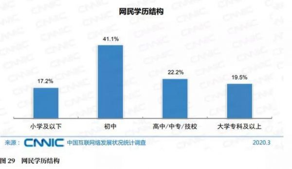 对于学历,CNNIC给的数据是这样的:截止2020年3月,小学及以下、初中、高中/中专/技校学历的网民群体占比分别为17.2%、41.1%、22.2%,受过大学专科及以上教育的网民群体占比为19.5%。看起来我国网民接受过大学教育的不足两成,还挺符合二八比例似的。计算一下19.5%的大学网民,大概是1.75亿人,高中网民大概2个亿。