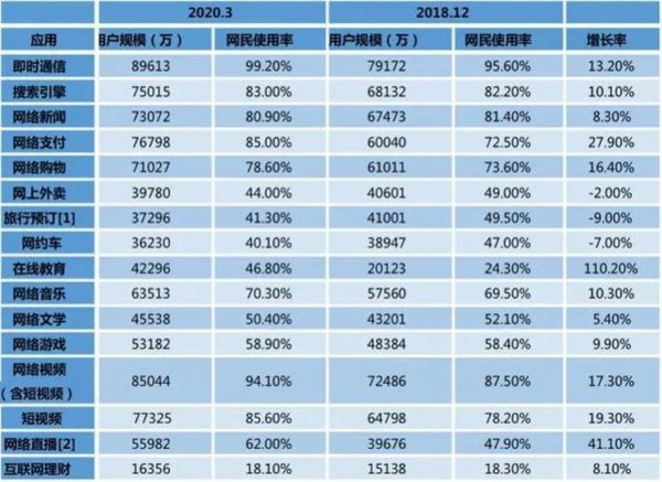 2018.12-2020.3网民各类互联网应用用户规模和使用率