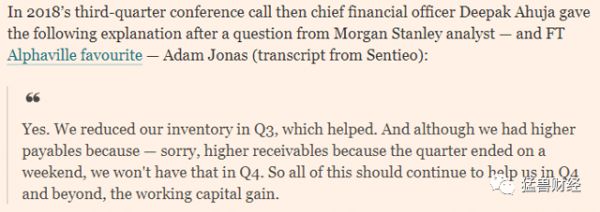 在2018年第三季度电话会议上,时任首席财务官Deepak Ahuja在回答摩根斯坦利分析师 Adam Jonas的问题后,对于应收账款比较高的问题,作出了解释:“因为这个季度结束于一个周末(银行关门了),但我们在第四季度不会有……”,暗示是由于周末银行关门,核算时出现了不一样的情况。