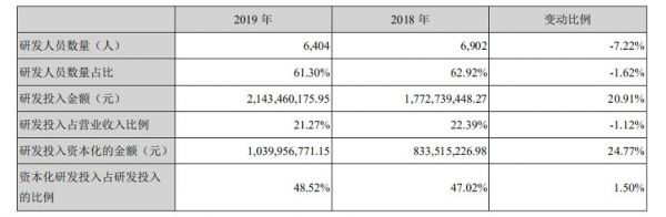 事实上,科大讯飞的研发资本化率本就远高于同行,对比2019年海康威视、大华股份、恒生电子这一指标为0,做到全部费用化,科大讯飞的净利润实乃成色不足。另外,去年屡屡被传的裁员消息,在研发附表中也得到了证实,截至2019年末科大讯飞研发人员6404人,比2018年末减少498人。