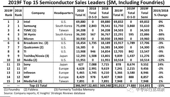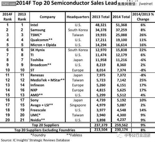 常年以来,欧洲三巨头在全球半导体业中的排名一直被美国、韩国,以及中国台湾的台积电所压制,很难进入前十。下图所示为IC Insights给出的2014年排名。