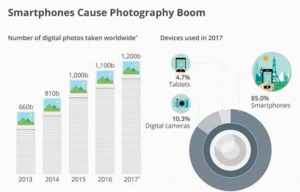 根据InfoTrends的报告,2017年,人类共拍摄了14万亿张照片,而这其中有85%是使用智能手机拍摄的。
