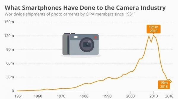 全球相机和影像产品协会(CIPA)是一个由索尼、尼康、佳能、奥林巴斯和卡西欧等公司组成的全球协会。根据它的统计数据,2018全球相机出货量和2010年的高峰相比,已经下降了84%,今天全球相机产业已经下降到了1980年代的水平。