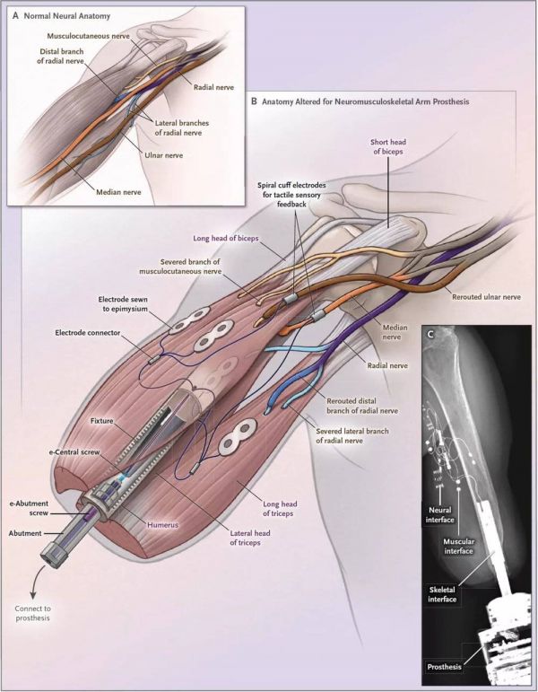 同时,神经肌肉骨骼植入物可以连接到任何市售的手臂假体,从而使其更有效地操作。