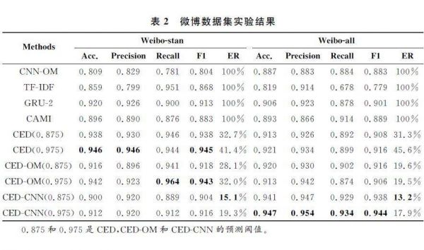 我们使用准确率、召回率和F1等评测指标评估这些模型的性能。此外,为了证明早期检测模型的有效性,提出提前率(ER)评估预测时使用转发文本的百分比,较低的ER值意味着模型使用较少的转发信息,可以更早地检测到谣言。我们将展示两个预测阈值设置(0.875和0.975)下的预测结果。表2列出了各种评估指标下不同方法的详细结果。我们加粗每列的最佳结果。