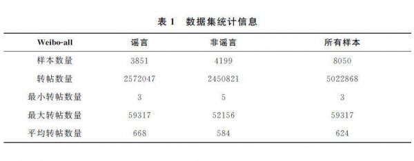我们使用Yu等(2017)的研究中来自新浪微博的谣言数据集评估模型的有效性,标记为“Weibo-stan”。我们获取数据集中的微博ID列表,并收集每条微博的所有转发信息。此外,为了在更多的情况下验证模型的性能,我们还抓取了更多的微博数据来构建更大的数据集,称为“Weibo-all”。为了获取更多的微博数据,我们从报告各种谣言信息的新浪社区管理中心获得了一组已知的谣言。我们还收集了相当数量的非谣言微博。表1列出了这两个数据集的详细统计数据。