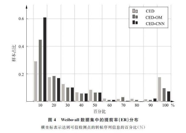 从这个图中,我们发现:(1)在使用到的转发信息量少于10%的情况下,CED/CED-OM/CED-CNN可以分别检测约30%/40%/60%的微博。这验证了额外考虑原始微博信息以及利用卷积神经网络建模的优势。与此同时,我们提出的三种CED方法都可以对谣言做出有效的早期检测。(2)在使用整个转帖序列进行检测时,占比出现了局部峰值(使用100%转帖信息)。可以看出,这种情况在CED-CNN中较少,小于10%,表明CED-CNN进行可检测所需要的转帖信息量更少,具有较高的转帖信息利用率。