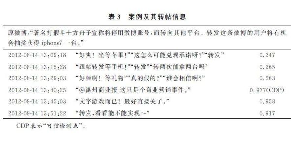 为了更直观地说明,我们选择了一个被正确预测为谣言的代表性案例,并在表3中展示出其转帖序列。我们还显示了最后一列中每个时间间隔区间对应的预测概率。