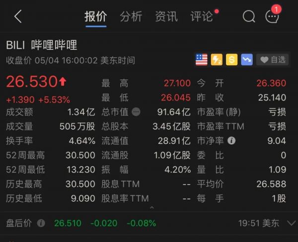 刷屏之后,B站美股盘前涨超4%;一天之后也就是北京时间5月4日晚间,B站的股价一改连日下跌的颓势,开盘大涨,股价一度涨近8%,市值暴涨6.7亿美元,约48亿人民币。截止收盘,B站市值达到91.64亿美元,较前一天仍涨了4.8亿美元,折合人民币34亿。