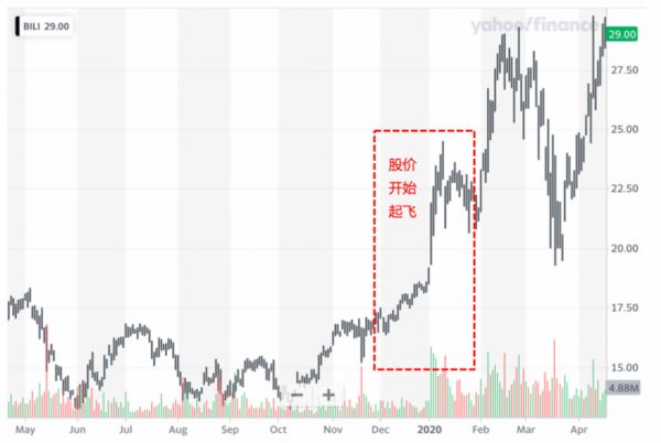 正是从这时起,B站破壁出圈的意图点燃了资本市场的无限想象。自 2018 年上市以来,B 站的股价一直在 10-20 美元之间波动,但进入2020年后,B站股价开始持续攀升。