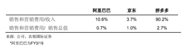 2019年拼多多全年收入为301亿元,市场销售和营销支出和总收入比率在90.2%的极高水平,相比而言,而阿里巴巴约为10%,京东为3.7%。此外,其销售和市场营销支出/ 销售总值比率为2.7%,而阿里巴巴为0.7%,京东为1.0%。