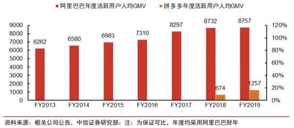 持续增长的市场营销让拼多多在用户量、用户活跃和GMV等电商核心数据上都表现亮眼,据农银国际的研报表示,预估拼多多在线市场份额在2019年约为9%,而阿里巴巴为63%,京东20%。