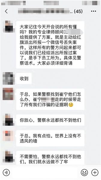 李卿报警后,曾经的导师刘哲曾给她发来一条公司内部微信群截图,公司负责人于某在群里发布消息称:“警告所有人,大家一条船,船翻了对谁都不好,谁如果泄露秘密,大家都得坐牢。”