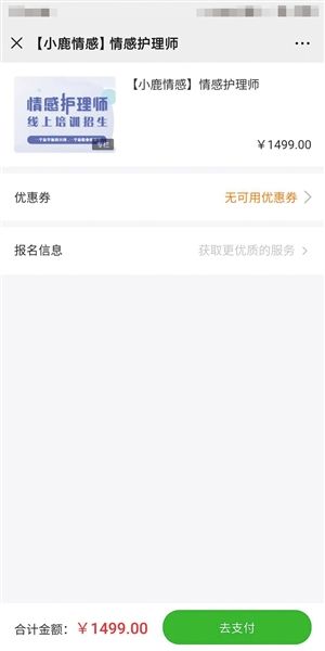 深圳市景安精神关爱基金会一名工作人员也证实上述说法,其称基金会和“小鹿情感”确有合作,基金会可向入驻“小鹿情感”的导师颁发“情感护理师”的职业技能证书。该基金会一名负责“情感护理师”培训的工作人员告诉记者,给小鹿培训的导师仅需1499元即可报名考试并发证。这名工作人员发来的报名链接明确显示:“小鹿情感要求承担心理咨询的从业者参加培训,获得情感护理师资格证书优先派单,将来作为上岗的资质要求。”