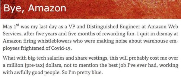 5月1日,亚马逊云计算事业部副总裁和资深工程师Tim Bray愤而辞职,放弃超过百万美金的薪水和未行权的亚马逊股票,以此抗议亚马逊开除参加罢工抗议的仓库工人(‘吹哨人’)。