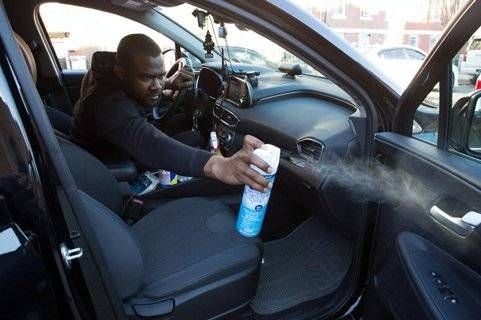 纽约Uber司机Adama Fofana正在为自己的车辆消毒